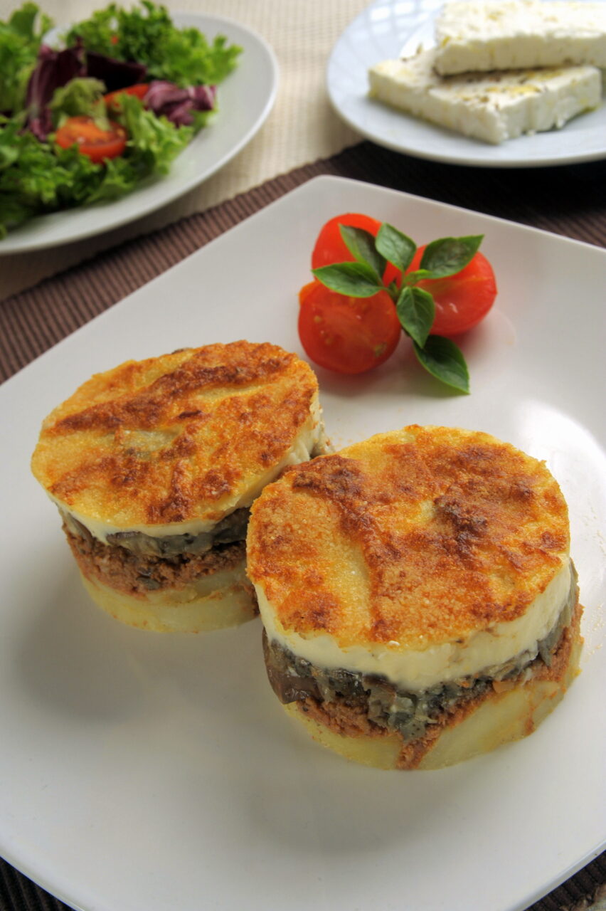 - Βάζουμε πάνω από τις πατάτες 30 γρ. παρμεζάνα και την σάλτσα μπολοναίζ, από πάνω στρώνουμε τις μισοψημένες μελιτζάνες βάζοντας, άλλα 30 γρ. παρμεζάνα και την μπεσαμέλ.