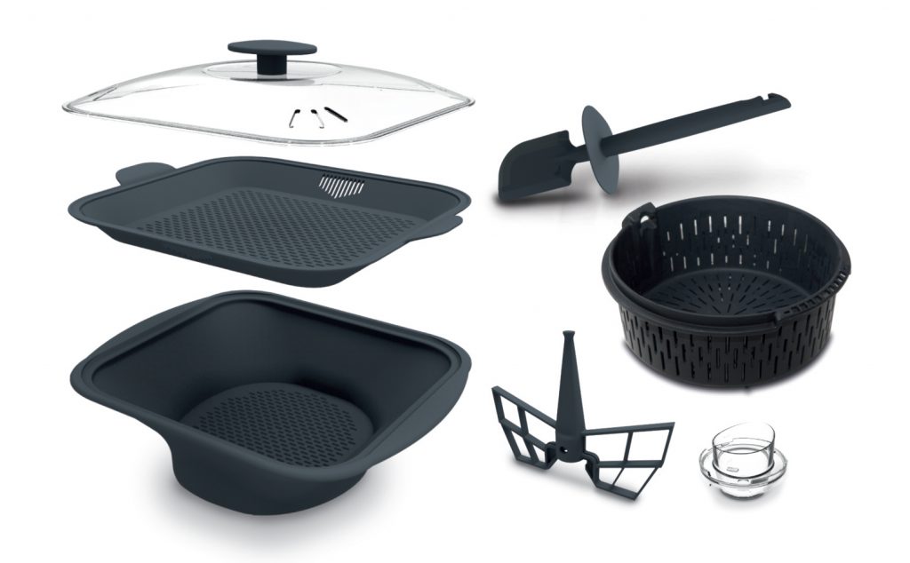 Έχει πολύ δυνατό μοτέρ, ενσωματωμένη ζυγαριά που ζυγίζει ανα γραμμάριο, κάδο από ειδικό ανοξείδωτο ατσάλι χωρητικότητας 2 λίτρων, ατμομάγειρα 2 επιπέδων, ένα καλαθάκι, μια σπάτουλα, μια μεζούρα και ένα ειδικό εξάρτημα για μαρέγκα (πεταλούδα).